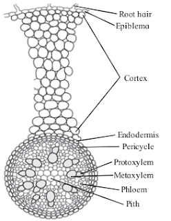 Answer : The transverse section of a typical dicotyledonous root shows following anatomical features. The outermost single layer of cells without cuticle is Epiblema. Some of its cells are prolonged into unicellular root hair. Next to it is the Cortexwhich consists of several layers of typical parenchymatous cells. After the death of epiblema, outer layer of cortex become cutinized and is called Exodermis. The cortical cells store food and water. The innermost layer of cortex is called Endodermis.