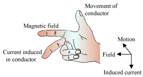The direction of current induced in a conductor can be obtained by holding the thumb, the index finger, and the middle finger of your right hand mutually perpendicular to each other. In this situation, the thumb indicates the direction of the motion of the conductor, the index finger points along the magnetic field, and the middle finger points along the current induced in the conductor.