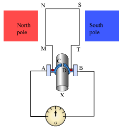 A generator consists of a rectangular coil MNST of insulated copper wire placed between two strong magnetic poles. The two ends of the coil MNST are connected with brushes A and B of rings C and D respectively. The inner sides of the rings are insulated. They are attached with an axle X, which can be rotated mechanically. Brushes A and B are connected with a galvanometer that can measure the flow of current in coil MNST.
